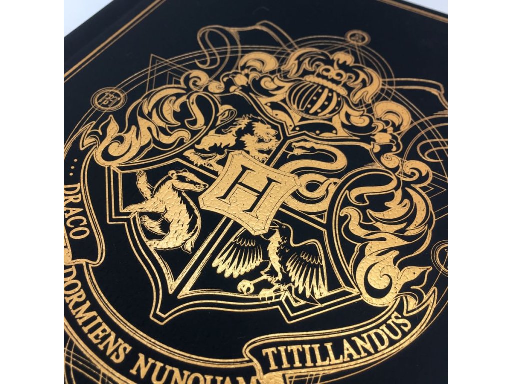 Kouzelný design – motiv Bradavic (Hogwarts) ve zlaté barvě na černém podkladě působí sofistikovaně i tématicky pro fanoušky světa Harryho Pottera.